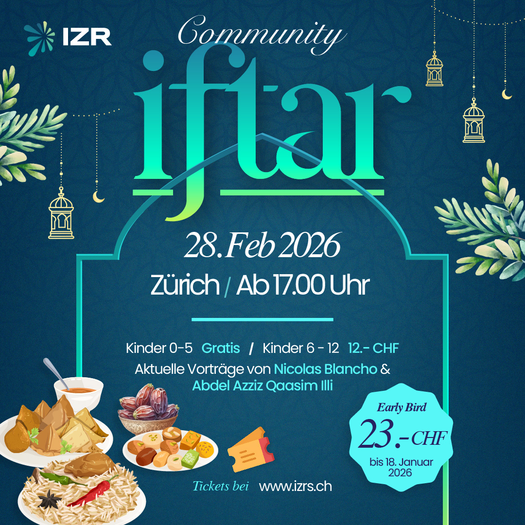 Hast du Lust auf ein Community Iftar mit Geschwistern aus dem Raum Zürich? Dann laden wir dich herzlich zu unserem öffentlichen Gemeinschafts-Iftar am Freitag, 28. Februar 2026, ein. Ein Abend der Begegnung, des Austauschs und des Gebets – für die ganze Familie.