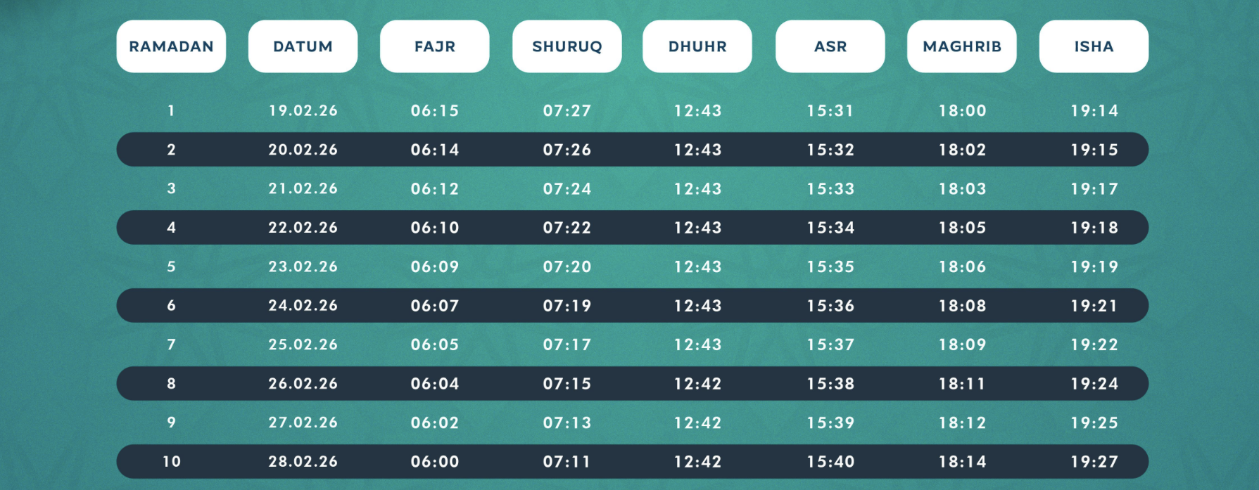 -> Hier findest du gestaltete Ramadan Kalender 2026 für die Schweiz als PDF oder online für alle europäischen Orte.